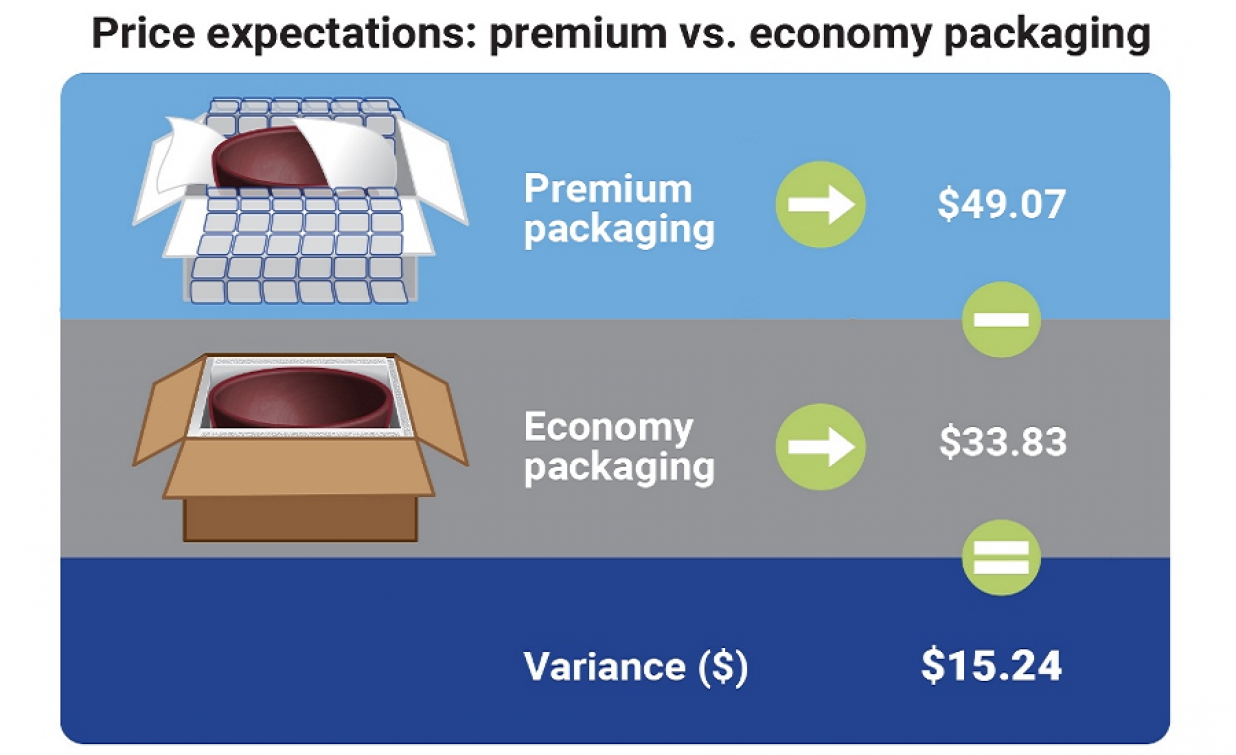 The two groups were presented with a box prepared with very different packaging. One package is best described as ”economy”—plain brown box with white polystyrene foam for inside protection and clear carton sealing tape. The other package would be considered “premium.” The product was housed in a white box, clear inflated hybrid cushioning featuring a square pattern to protect the contents and soft white foam wrapped around the bowl with a “thank you” sticker. White carton sealing tape was used on the exterior. Participants only saw one version of the packaging so they were not aware that there was a different option.
